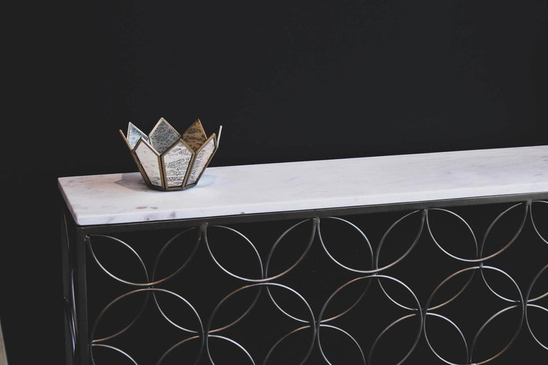 Elevate your interior design with the Regal Console Table. Its narrow depth makes it suitable for any size space, while the exotic Banswara marble adds a touch of luxury. The unique metal pattern and champagne metal finish create a stylish and bold look. Crafted with a white stone top and an iron base with a brass finish, this console table exudes elegance. The table top thickness is 0.5, and the leg height is 1.25. Add glamour and sophistication to your home with this stunning piece.